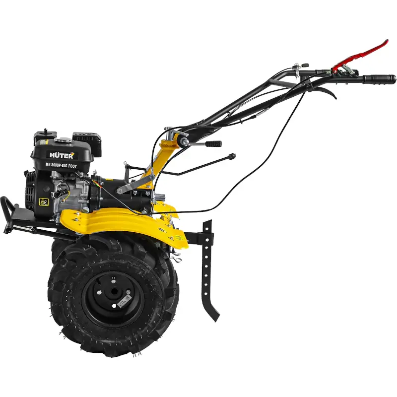 Сельскохозяйственная машина Huter МК-8000P BIG FOOT оснащена большими пневматическими колесами типа для легкой проходимости по любому бездорожью. Ширина захвата культиватора составляет 100 см – это самая компактная модель в линейке.