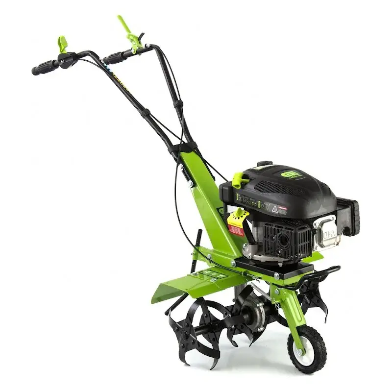Самоходная бензиновая модель оснащена фрезами, которые обеспечивают ширину обработки 60 см. Этого достаточно для эффективной культивации участка площадью до 2000 м2. При этом работу упрощает передача скорости для движения вперед. За счет этого вам не придется толкать агрегат по участку, прикладывая физические усилия.