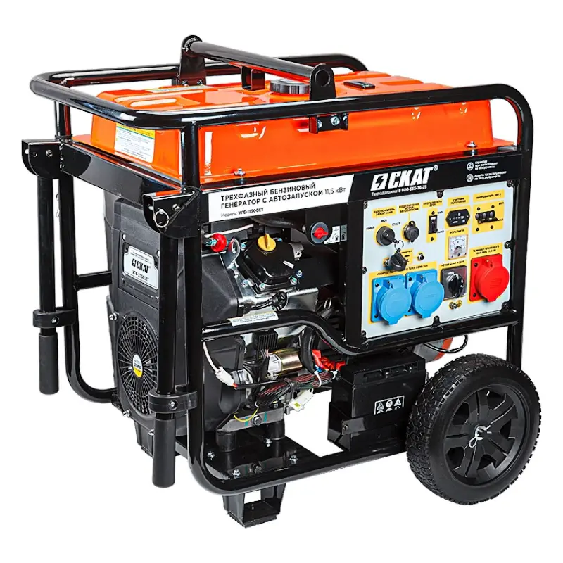 Трехфазный бензиновый генератор СКАТ УГБ-11500ЕТ мощностью 11,5 кВт обеспечит электроэнергией коттедж, фермерское хозяйство, магазин, строительную площадку или даже небольшой цех.