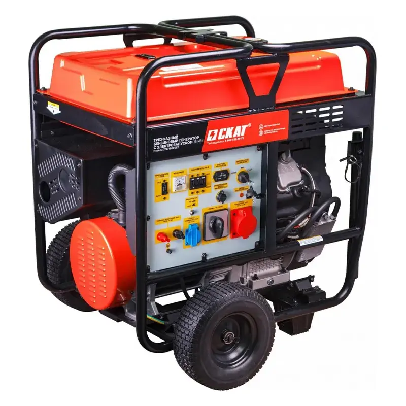 Трехфазный бензиновый генератор СКАТ УГБ-16000ЕТ мощностью 16 кВт на 380 вольт и 15 кВт на 220 вольт обеспечит электроэнергией офис, коттедж, фермерское хозяйство, магазин, строительную площадку, производственный цех.