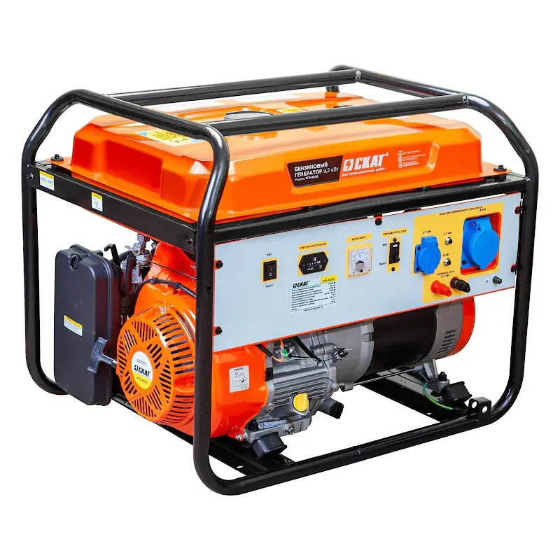 Бензиновый генератор СКАТ УГБ-9200 предназначен для резервного энергоснабжения техники, осветительных приборов и электроинструмента с максимальной суммарной мощностью до 9,7 кВт. Передвижная электростанция может служить аварийным источником питания на объектах, для которых критически важна бесперебойность энергоснабжения, например, АЗС, выездные объекты торговли, детские и медицинские учреждения. Мощности генератора достаточно для резервного электропитания частного дома или дачи, обеспечения энергией стройплощадки, аварийной или монтажной бригады.