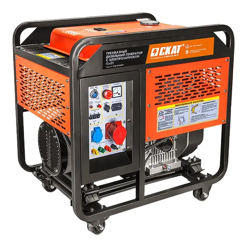 Трехфазный дизельный генератор СКАТ УГД-15000EТ мощностью 15 кВт обеспечит электроэнергией дом, строительную площадку, цех, производственный участок, рефконтейнер, небольшой вахтовый поселок, придорожное кафе.