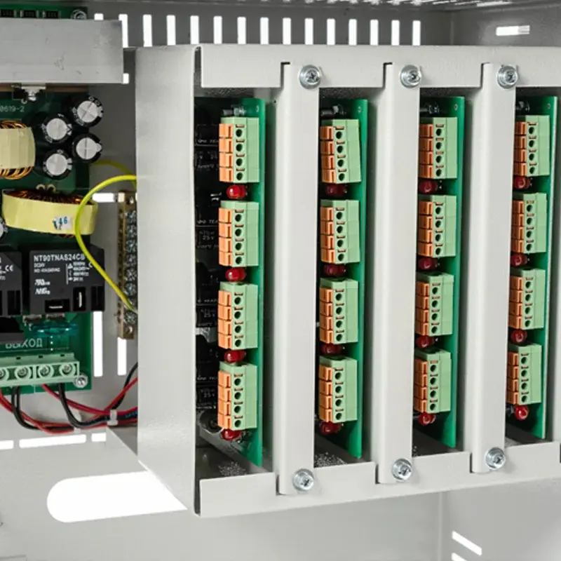 В тридцатидвухканальном источнике предусмотрена возможность плавной регулировки напряжения и настройки тока потребления для каждой пары выходов. Благодаря наличию пяти выходов типа «открытый коллектор» можно подключить внешние цепи индикации для выдачи информационных сообщений и обеспечить управление внешними устройствами автоматики.