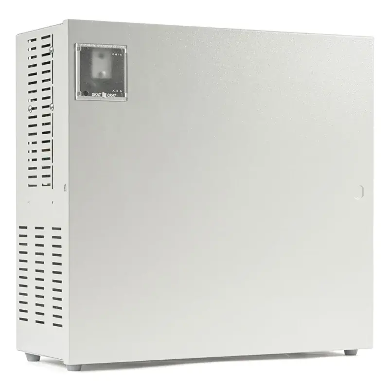 Источник питания SKAT-V.32 предназначен для обеспечения питанием до 32 выходов видеокамер и других потребителей с номинальным напряжением 12 В при работе от сети переменного тока 220 В и в резервном режиме от аккумуляторной батареи 24 В. Системы электронной защиты от перегрева, перегрузки, короткого замыкания, неправильного подключения клемм и глубокой разрядки АКБ обеспечивают стабильное автоматическое функционирование устройства. ИБП рассчитан на работу в температурном диапазоне от 0 до +40 °С.
