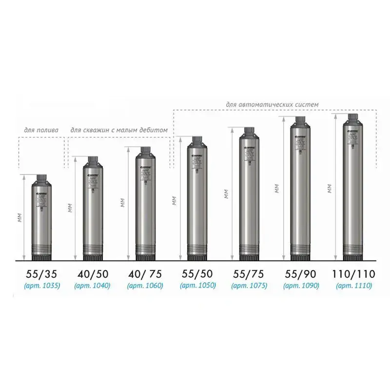 Диаметр корпуса насоса 98 мм. Это позволяет опускать его в скважины с внутренним диаметром обсадной трубы 110 мм. Максимальная глубина погружения под воду составляет 30 м. А для работы достаточно опустить корпус на 10-15 см под воду. Благодаря этому он подходит для эксплуатации в гидротехнических сооружениях с небольшим дебитом.
