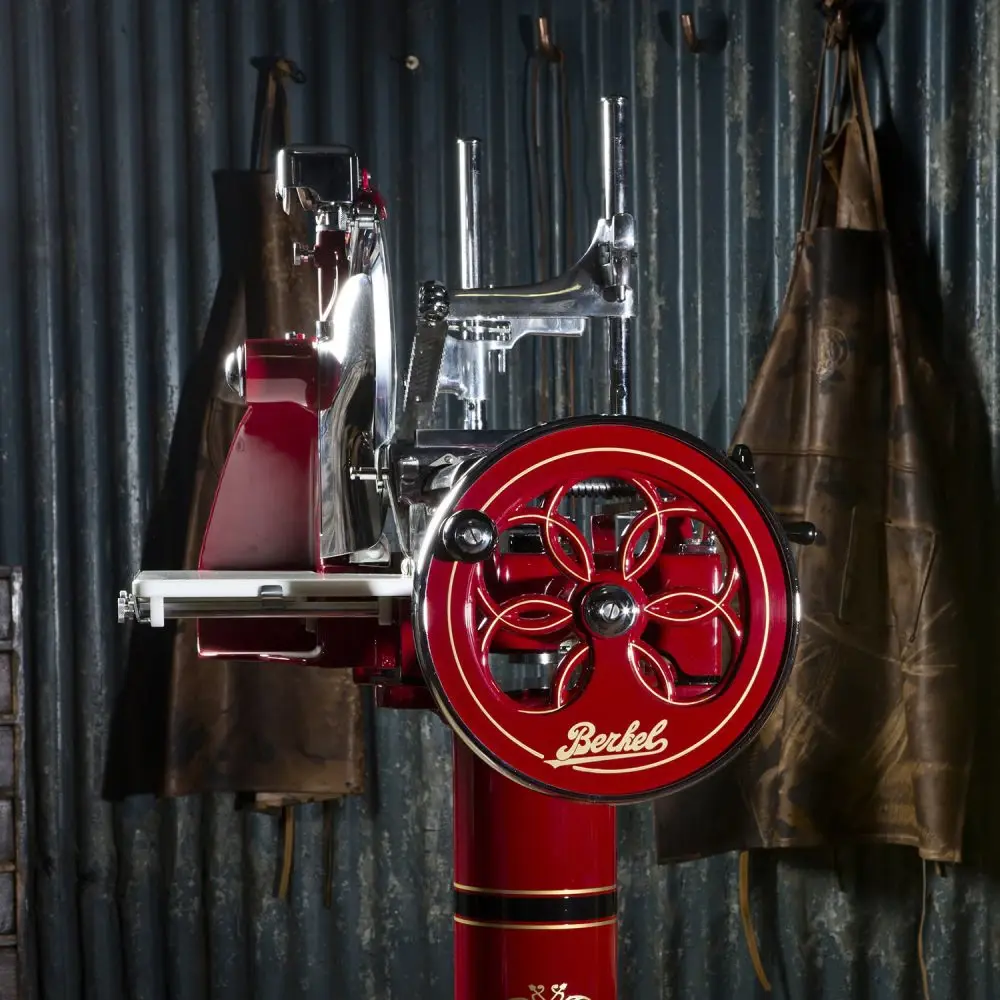 Слайсер Berkel Flywheel (Volano) P15 красный на подставке предназначен для нарезки мяса, сыра, колбасных изделий и других продуктов питания на ровные и равные ломтики на предприятиях общественного питания и торговли.
