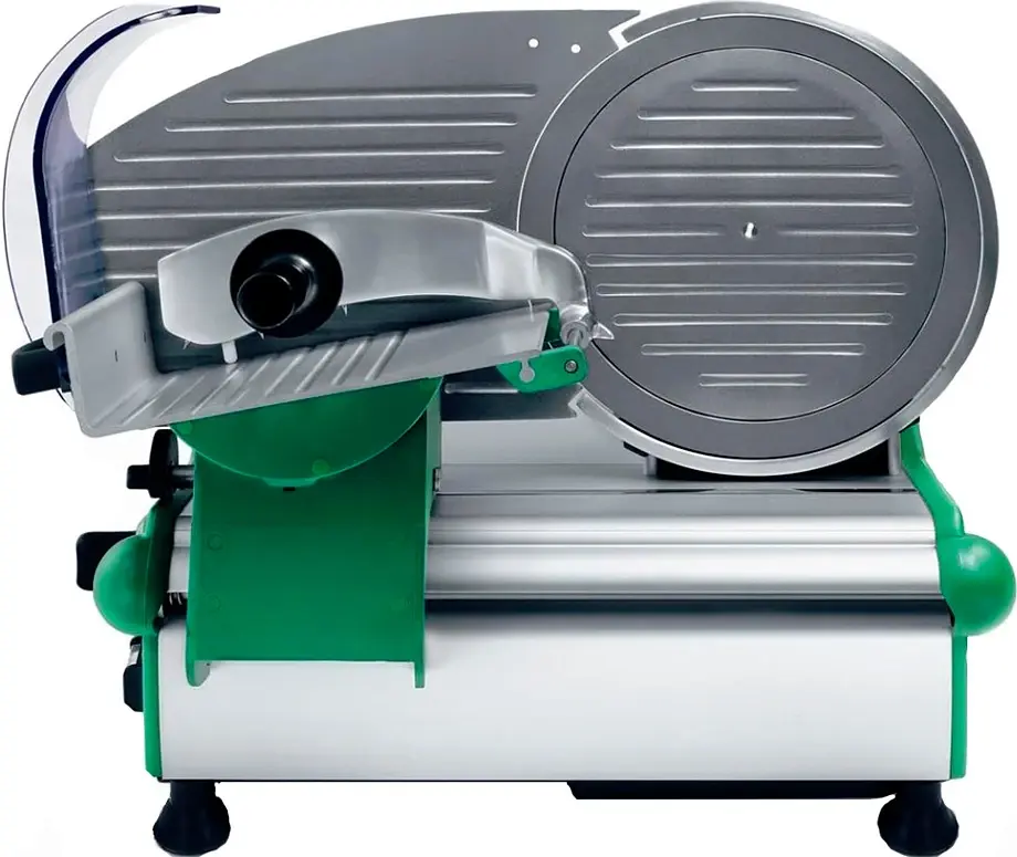 Слайсер работает в полуавтоматическом режиме. Наклонная каретка возвратно - поступательным движением толкается по направлению к вращающемуся дисковому ножу. Продукт, закрепленный на продуктовом столе каретки держателем, под действием сил гравитации давит на нож, что способствует очень быстрой, эстетичной и экономной нарезке.