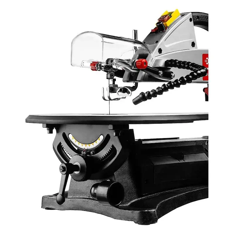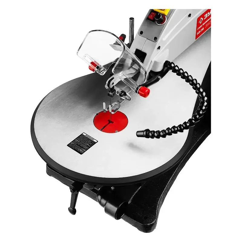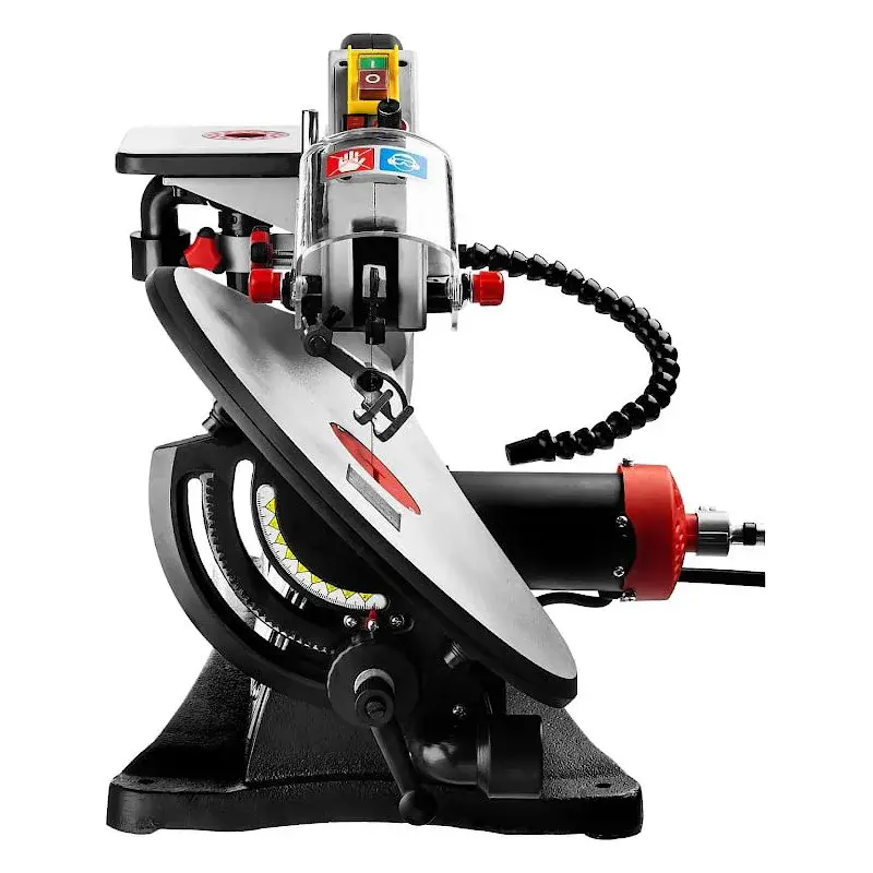 Лобзиковый станок способен обрабатывать заготовки толщиной до 50 мм. При необходимости создания сложных пропилов, например, при фигурной резке, можно изменить наклон рабочего стола. Максимальный угол составляет 45°.