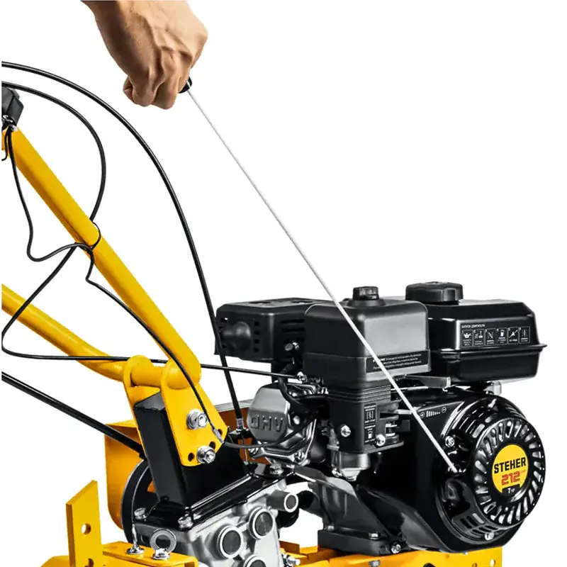 С трехступенчатой коробкой передач легко выбрать оптимальный режим работы для каждого типа почвы. Скорость вращения приводного вала составляет 82 об/мин на первой передаче и 113 об/мин — на второй. Задняя скорость 51 об/мин обеспечивает маневренность мотоблока STEHER GT-300 L для возделывания небольших участков.