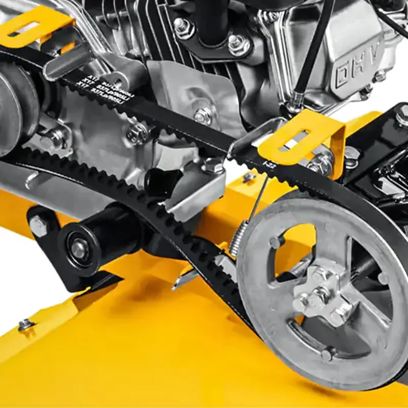 Бензиновый мотоблок оснащен четырехтактным двигателем мощностью 7 л.с. и механическим шестеренчато-цепным редуктором в алюминиевом корпусе. Крутящий момент передает сцепление с износостойким клиновидным зубчатым ремнем. Для активного навесного оборудования предусмотрен дополнительный шкив. Объем бензобака составляет 3,6 л, а норма расхода топлива — 1,9 л/ч.