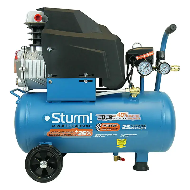 Компрессор масляный Sturm! AC93124P. Надежный и производительный профессиональный воздушный компрессор с прямым приводом и увеличееным размером цилиндра. Предназначен для широкого спектра работ с разнообразным пневмоинструментом. Применяется на загородных участках, в гаражах и на небольших производствах.