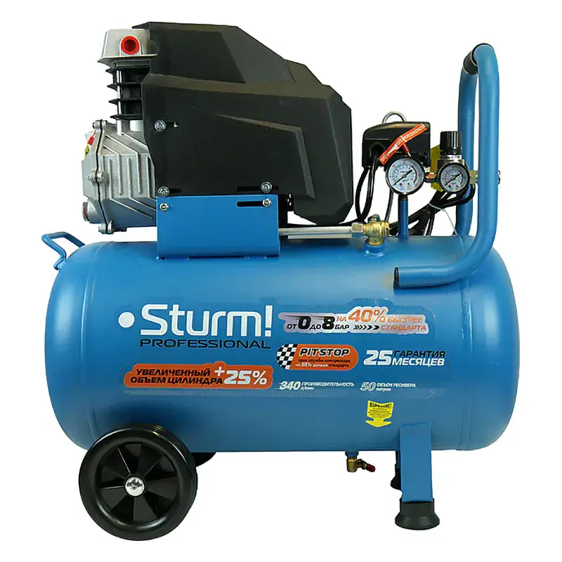 Компрессор масляный Sturm! AC93150P. Надежный и производительный профессиональный воздушный компрессор с прямым приводом и увеличееным размером цилиндра. Предназначен для широкого спектра работ с разнообразным пневмоинструментом. Применяется на загородных участках, в гаражах и на небольших производствах.