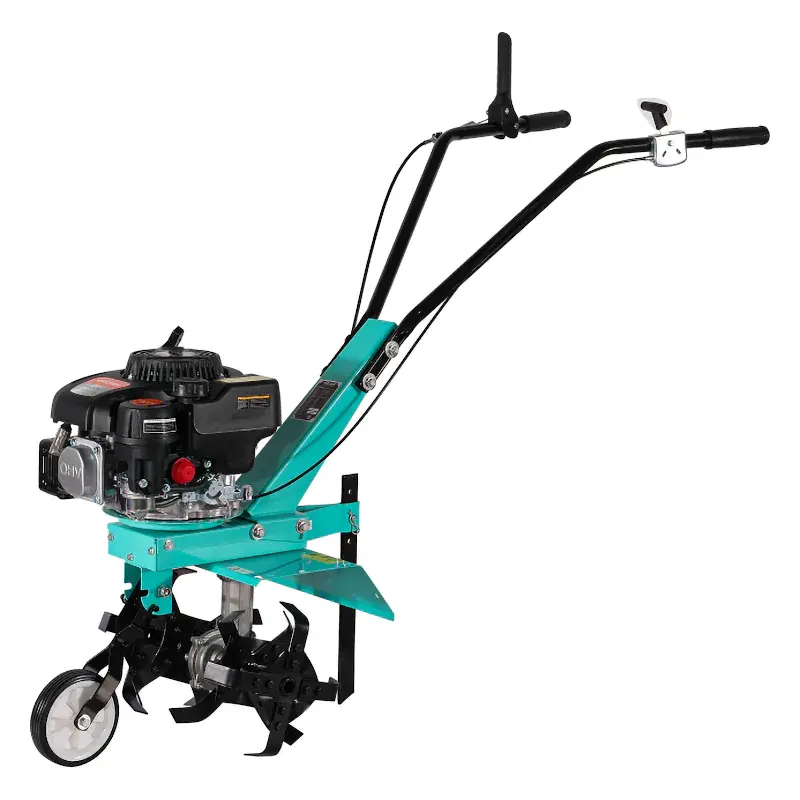 Бензиновый культиватор оснащен колесом, которое облегчает его перемещение по участку. Защитные кожухи предохраняют от летящих из-под фрезы камней и комьев земли. Регулируемый по высоте сошник обеспечивает равномерную глубину вспашку почвы. Все элементы управления удобно расположены на рукоятках. В экстренном случае двигатель можно заглушить, нажав находящийся под рукой выключатель. Возвратный механизм автоматически приводит стартер в пусковое положение для быстрого последующего запуска.