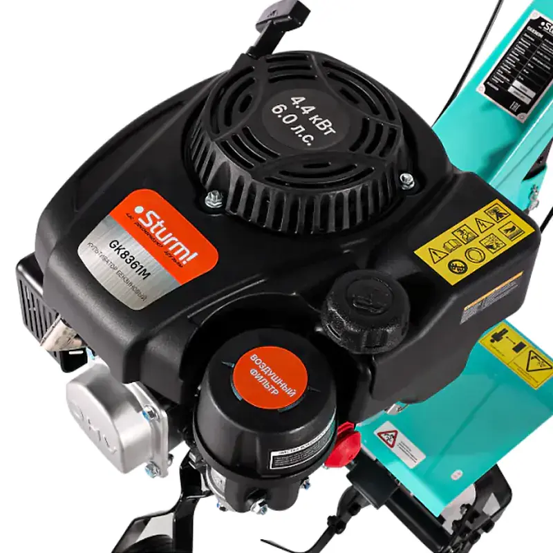 Культиватор Sturm! GK8361M оборудован четырехтактным двигателем мощностью 6 л.с. с ручным стартером и воздушным охлаждением. Отличительная особенность модели — возможность использования такого навесного оборудования, как грунтозацеп, косилка, рыхлитель, окучник и картофелекопалка. Благодаря высокой номинальной частоте вращения вала 3600 об/мин и прочной конструкции фрез из легированной стали мотокультиватор справляется с рыхлением и вспашкой почвы всех видов. Глубина обработки составляет 200 мм; ширина — 380 мм.