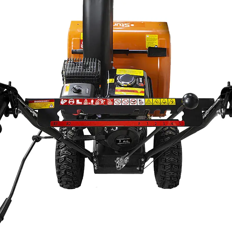 Широкие колеса с развитым анти-снежным протектором позволяют уверенно двигаться по рыхлому снегу. Широкий набор скоростей: 5 вперед/2 назад, для настройки оптимальной скорости движения снегоуборщика.