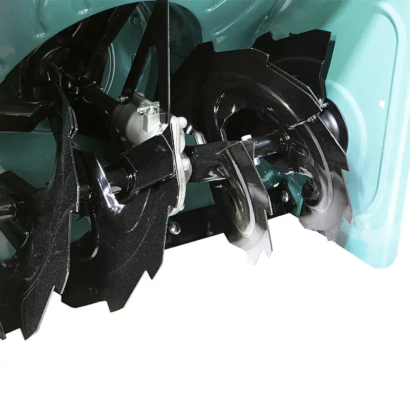 Зазубренный шнек первой ступени успешно измельчает слежавшийся снег и может справиться даже с настом толщиной до 2 см. Высокооборотистая вторая ступень снегоуборочного агрегата отбрасывает снег на расстояние до 12 м.