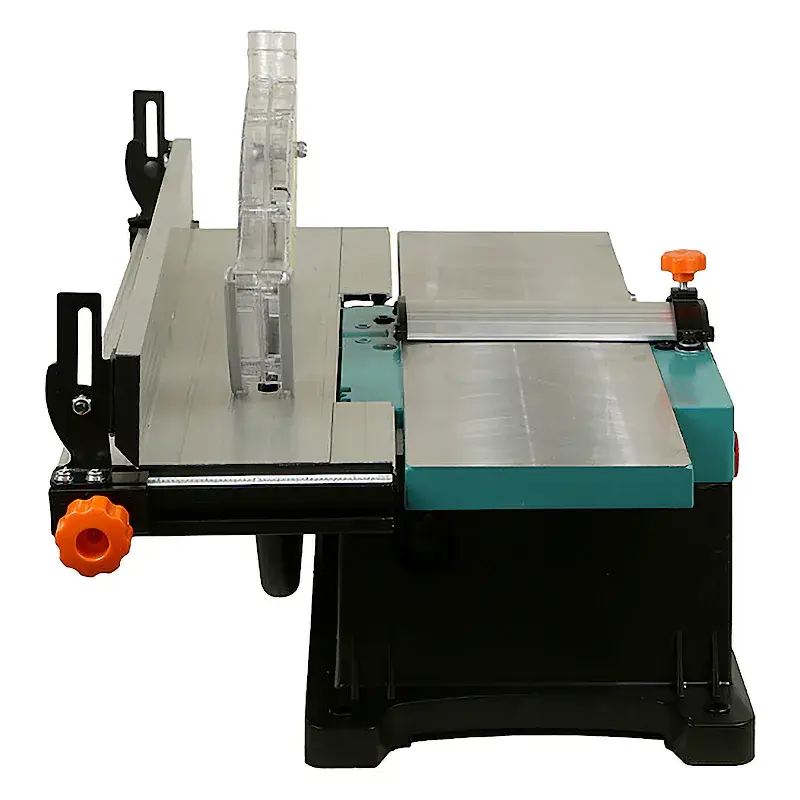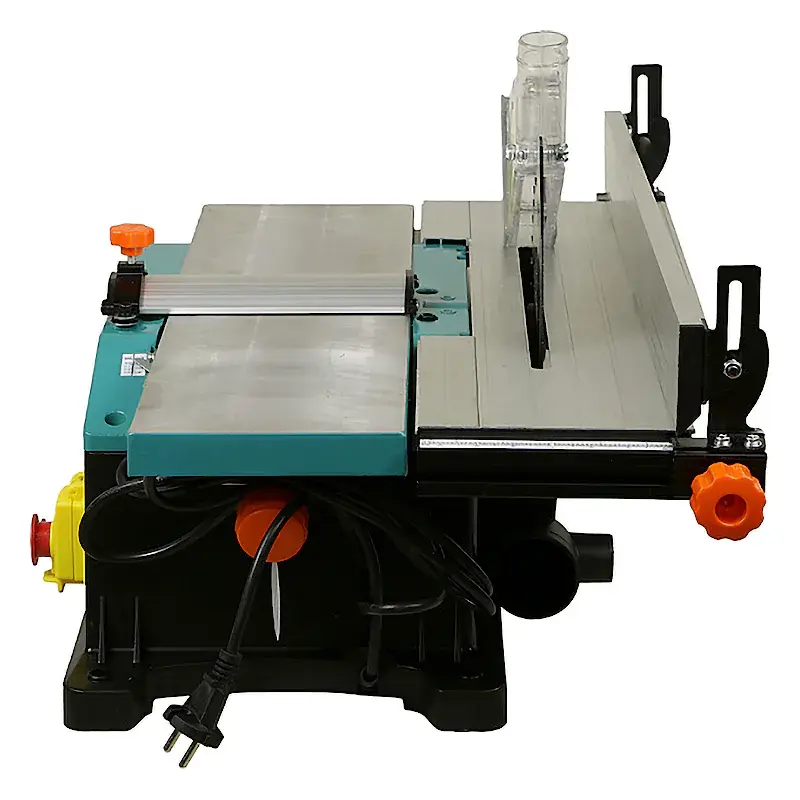 Частота вращения шпинделя портативного деревообрабатывающего станка достигает 4780 об/мин, что обеспечивает быстрое и качественное выполнение строгальных и распиловочных работ. Направляющая планка с линейкой позволяет выполнять точные пропилы вдоль кромки заготовки. Положение упора и параллельной рейки легко регулируется при помощи барашковых винтов. В комплект поставки входит высококачественный пильный диск с зубьями из карбида вольфрама, гарантирующий ровный и гладкий срез. Рабочий стол можно наклонить и зафиксировать для обработки заготовок под углом.