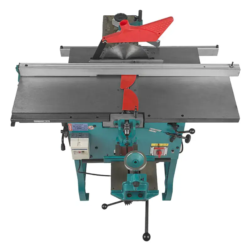Станок позволяет производить: строгание, фугование, рейсмусование, распиловку в размер с параллельной направляющей и угловым упором для распила под 45 градусов, сверление, фрезерование и шпунтование, заточку режущего инструмента (включая пильные диски) в одиночку заменяя 7 специализированных станков, экономя Ваше время и ресурсы.
