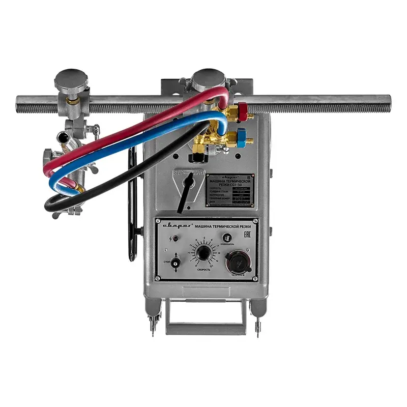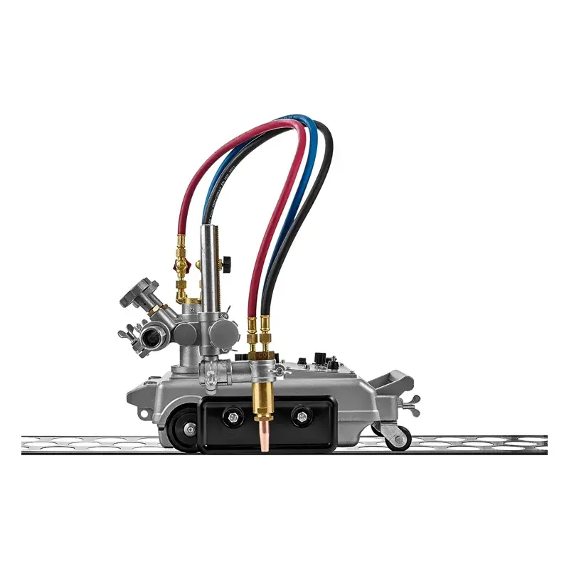 Резка выполняется газокислородным резаком, установленным в держателе на самоходной тележке. Зажим крепления резака для машин термической резки имеет реечный механизм, который позволяет перемещать резак, регулировать его высоту установки над поверхностью металла, а также устанавливать угол наклона резака в пределах ±45°. Для фиксации резака предусмотрены винты.
