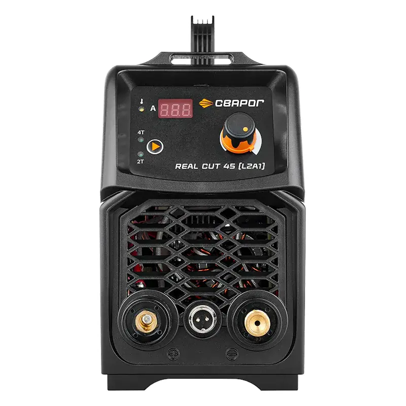Инвертор оснащен понятной панелью управления с дисплеем, кнопкой переключения режимов и тремя светодиодными индикаторами: перегрева, двухтактного и четырехтактного режимов. Поворотный регулятор тока поможет вам точно настроить аппарат для каждого конкретного материала. Для настройки давления предусмотрен встроенный манометр. Рукоятка облегчает переноску плазмореза.