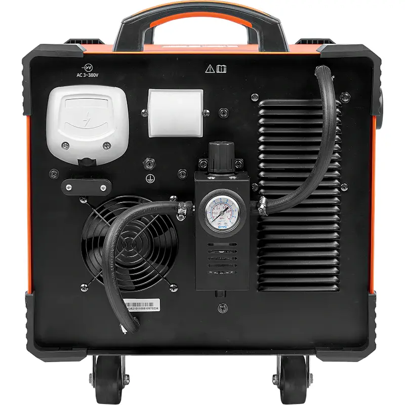 Несмотря на внушительный вес в 55 кг плазморез легко перемещать по рабочему помещению за счет транспортировочных колесиков. Ручки расположены по обеим сторонам корпуса, что позволяет переносить технику с кем-то в паре. Для продолжительной работы в аппарате установлена система защиты. Она оберегает технику от перегрузки, перегрева, чрезмерного напряжения в электросети, а также отсутствия фазы сети.