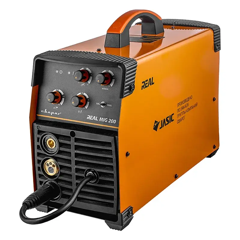 Сварочный инвертор Сварог REAL MIG 200 N24002N работает в режимах MMA и MIG/MAG, а также поддерживает регулировку сварочного тока от 10 до 200 А. Ролики рассчитаны на проволоку сечением 0,6, а также 0,8 и 1 мм.