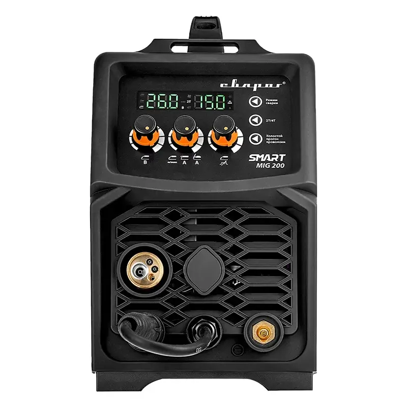 Сварочник с инверторной технологией стабильно работает при скачках и проседании напряжения до 120 В. Горелка поддерживает работу в двух- и четырехтактном режимах для удобства выполнения коротких и длинных швов. Мощные вентиляторы обеспечивают эффективное охлаждение. Сварочный аппарат Сварог REAL SMART MIG 200 BLACK N2A5 отличается небольшим весом и компактными размерами. Его удобно переносить и транспортировать благодаря наличию прочной верхней ручки.