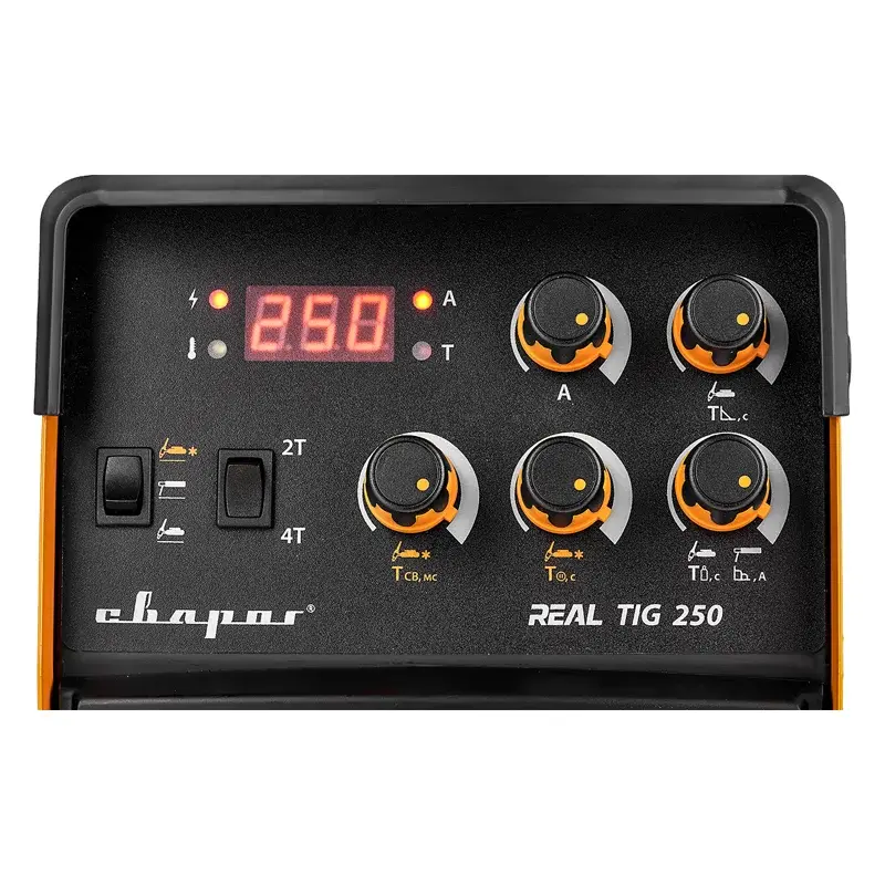 Многофункциональный сварочный аппарат REAL TIG 250 (W229) имеет режимы аргонодуговой сварки (TIG и TIG COLD) и ручной режим дуговой сварки (MMA) на постоянном токе (DC).