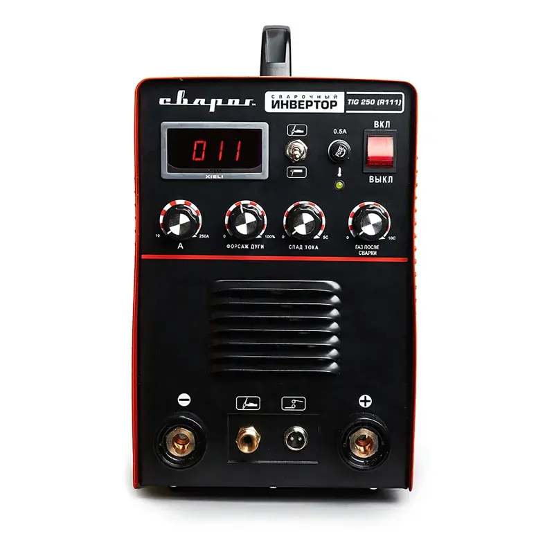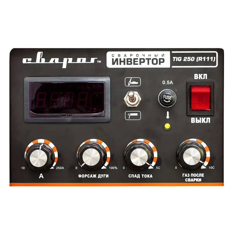 TIG сварочный аппарат серии STANDART TIG 250 (R111) профессионального уровня для аргонодуговой сварки (TIG) и ручной дуговой сварки покрытым электродом (ММА). Оборудован цифровым индикатором параметров сварки и большим набором ручных регулировок.
