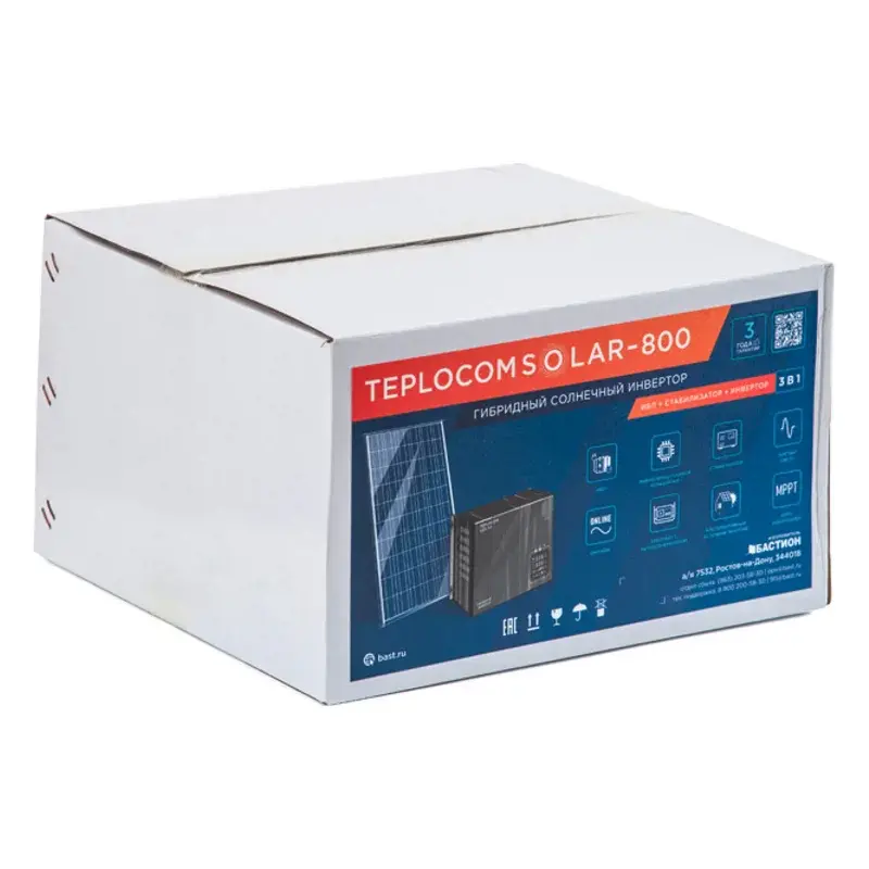 Источник бесперебойного питания для котла отопления TEPLOCOM SOLAR-800 заменяет сразу три устройства: стабилизатор, инвертор и ИБП. Обладает номинальной мощностью 800 ВА. Устройство обеспечивает чистый синус на выходе, за счет MPPT- контроллера эффективно заряжает аккумуляторные батареи, а также защищает от перегрузки и перегрева.