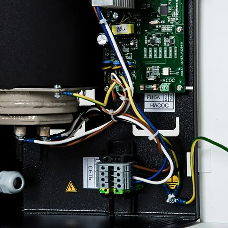 - SOS. В случае выхода из строя одного ТЭНа или симистора управления котёл продолжает работать на оставшихся ТЭНах, сигнализируя о проблеме.
