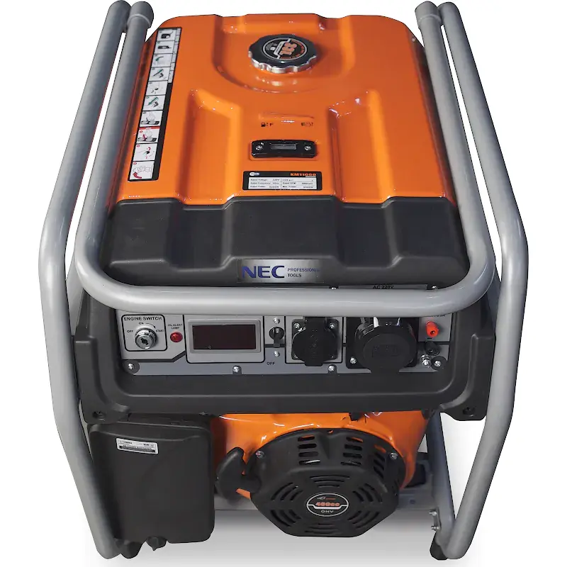 Синхронный альтернатор с медной намоткой позволяет вырабатывать чистый ток и выдерживать высокие нагрузки в момент запуска потребителей с электродвигателем. Кнопка запуска с электростартером облегчает процесс запуска генератора. Все рабочие механизмы прочно закреплены на массивной металлической раме.