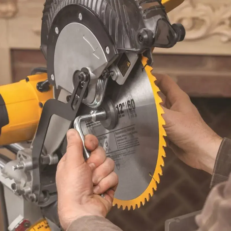 В торцевой пиле DeWALT DWS780 есть запоры угла наклона профилей. Они облегчают горизонтальный рез карнизов, плинтусов или багетов.