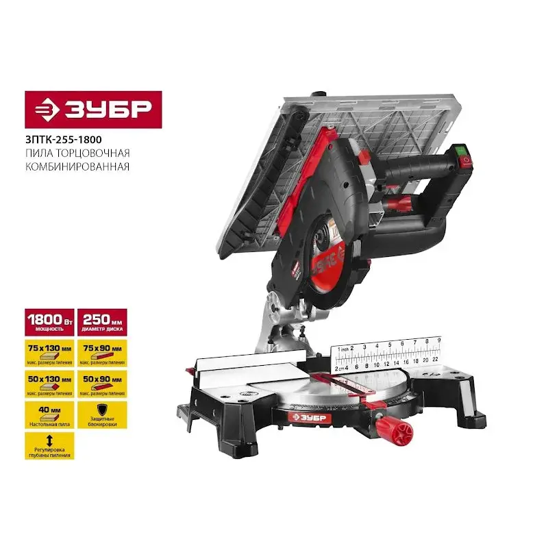 Диск диаметром 250 мм гарантирует работу ЗУБР ЗПТК-255-1800 с материалами разной толщины. Инструмент подходит для косого, прямого пиления, а также под наклоном.