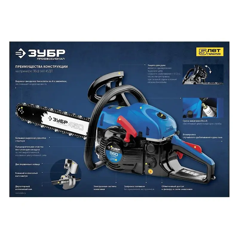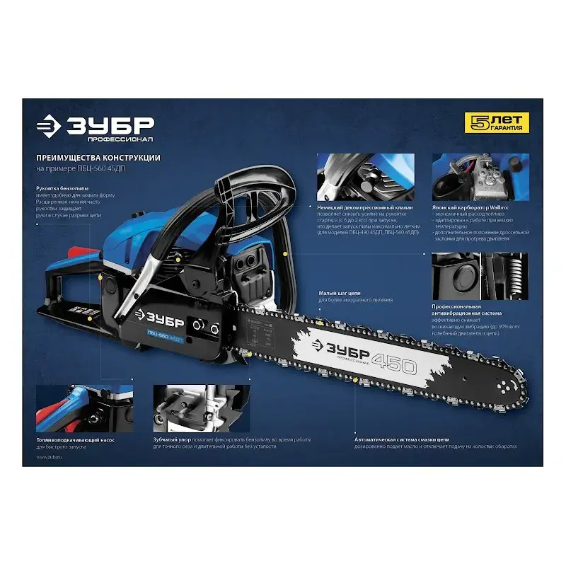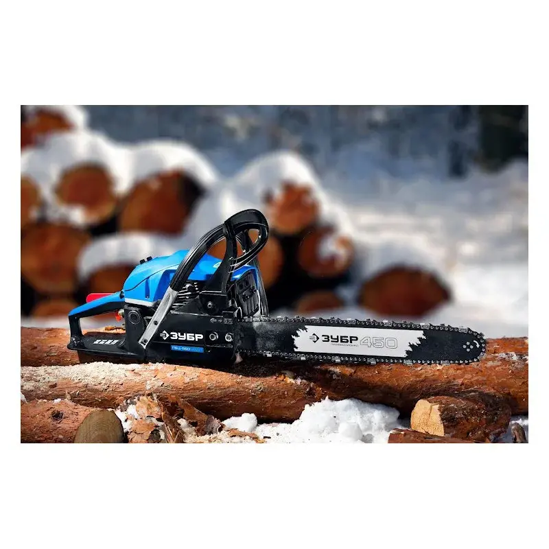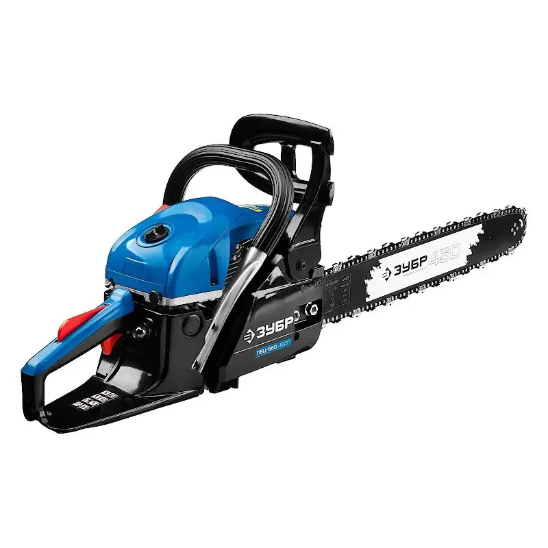Бензопила ЗУБР ПБЦ-560 45ДП мощностью 2,4 кВт подходит для распила заготовок из разных пород дерева. Инструмент поставляется в комплекте с кожухом шины и емкостью для приготовления бензиново-смазочной смеси.