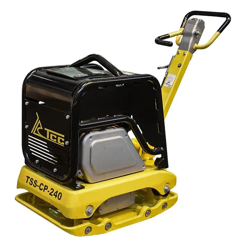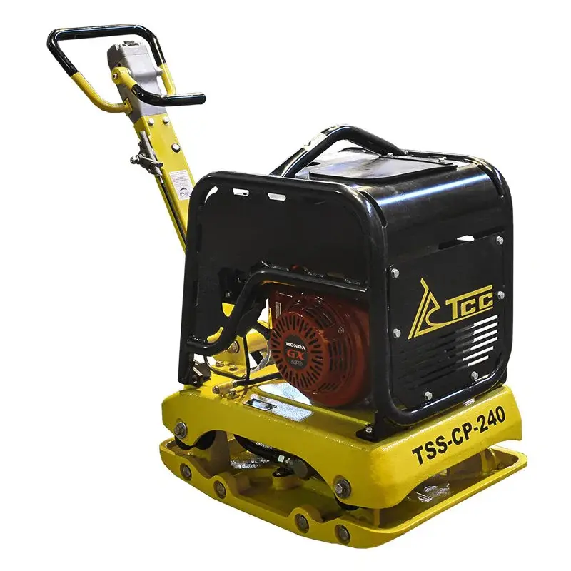 Виброплита TSS-CP-240 применяется для уплотнения грунта, щебня, гравия и других сыпучих материалов при проведении дорожно-строительных и ремонтных работ в ограниченных пространствах. Центробежная сила 35000 Н позволяет уплотнять грунт на глубину до 700 мм. Реверсивный режим удобен для трамбовки грунта в прямых траншеях. Устройство работает на бензиновом четырехтактном двигателе Honda GX270 мощностью 9 л.с. с ручным стартером. Производительность машины составляет 480–650 м2/ч.
