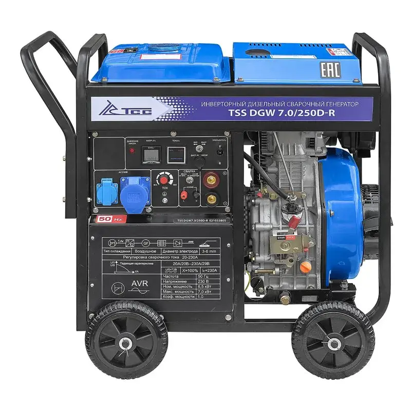 Сварочный дизельный генератор TSS DGW 7.0/250D-R — предназначен для проведения профессиональной Ручной Дуговой Сварки и питания электропотребителей в условиях отсутствия стационарной сети электроснабжения.