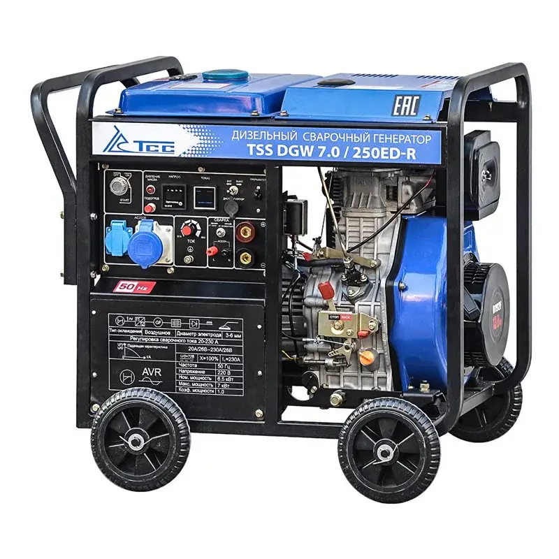 Сварочный дизельный генератор TSS DGW 7.0/250ED-R — предназначен для проведения профессиональной Ручной Дуговой Сварки и питания электропотребителей в условиях отсутствия стационарной сети электроснабжения.