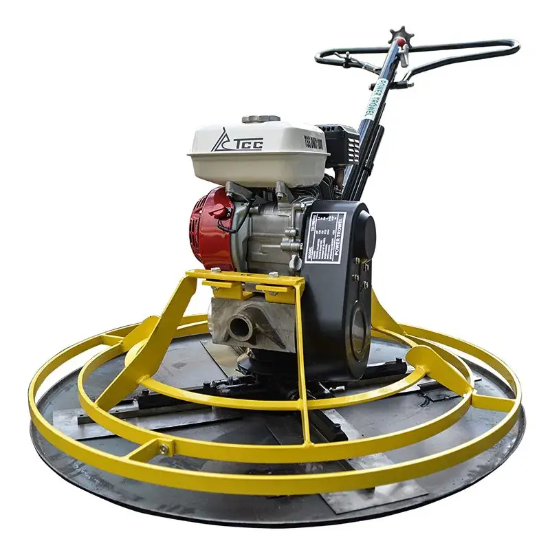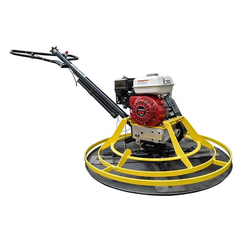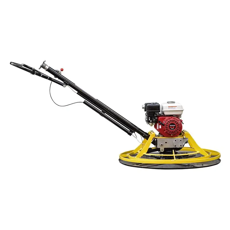 Бензиновая затирочная машина приводится в действие четырехтактным одноцилиндровым двигателем мощностью 5,5 л.с. с воздушным охлаждением. К заглаживанию приступают после того, как бетон выровнен, уплотнен виброрейкой и схватился до степени достаточной, чтобы выдержать вес машины. На первом этапе производится грубая обработка с помощью диска, затем — заглаживание затирочными ножами.