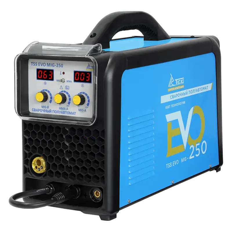Сварочный полуавтомат ТСС EVO MIG-250 поддерживает режимы ММА и MIG/MAG, выдает сварочный ток от 20 до 250 А. Аппарат сделан на базе IGBT транзисторов.