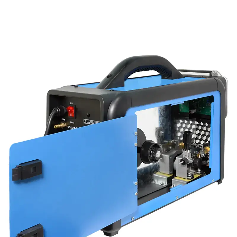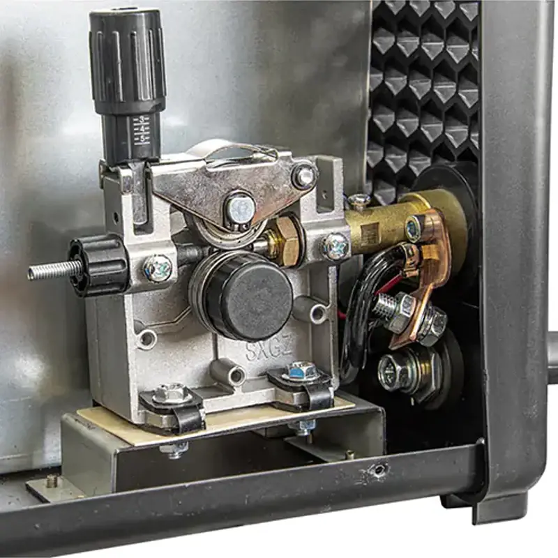 Панель управления углублена в корпус, поэтому никакие элементы не выступают наружу. Это обеспечивает их безопасность при хранении или транспортировке инверторного сварочного аппарата. Корпус сделан из листовой стали, что делает его максимально прочным. Он надежно защищает внутренние узлы от случайных повреждений. Рабочий процесс удобно отслеживать за счет двух дисплеев. На одном экране отображается текущий сварочный ток, а на втором — рабочее напряжение.
