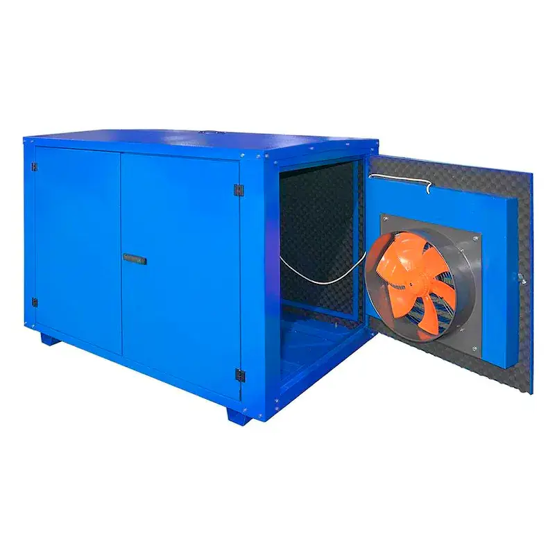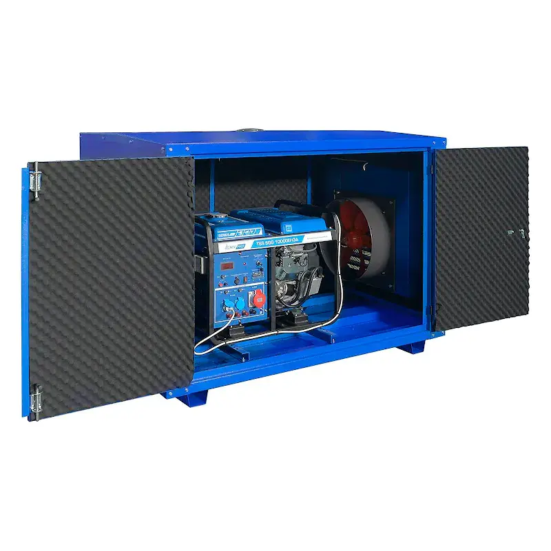 Шумозащитный кожух предназначен для защиты генератора от осадков, обеспечения безопасности работы и уменьшения уровня шума, исходящего от работающего генератора. Кожух изготавливается из стального листа толщиной 1,5-2 мм с порошковым покрытием и дополнительным шумозащитным покрытием. Для проведения технического обслуживания кожух имеет дверцы с удобным замком. Генераторную установку в шумопоглащающем кожухе можно эксплуатировать как в помещении, так и на улице при температуре окружающей среды от -25°С до +40°С.