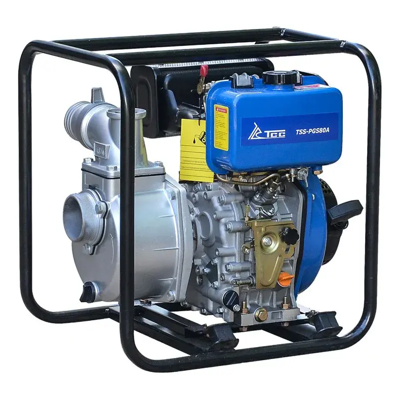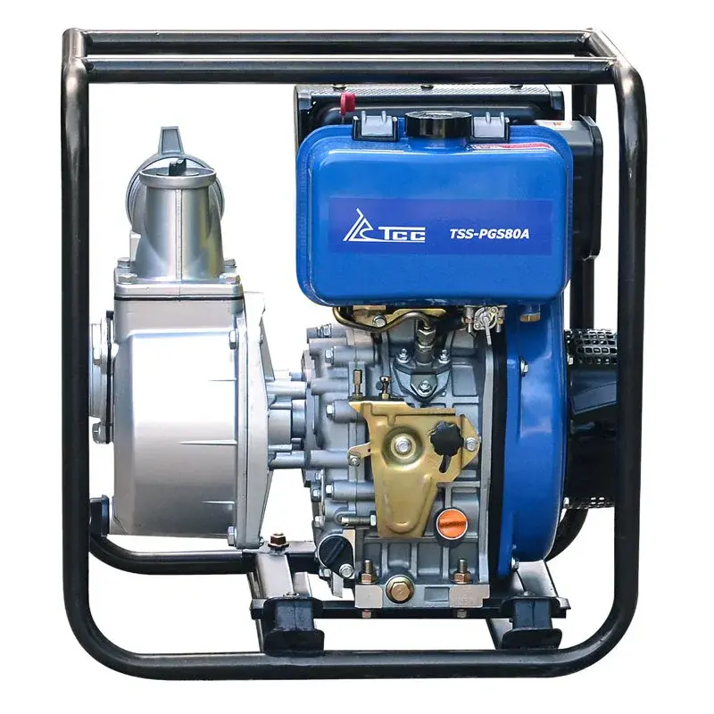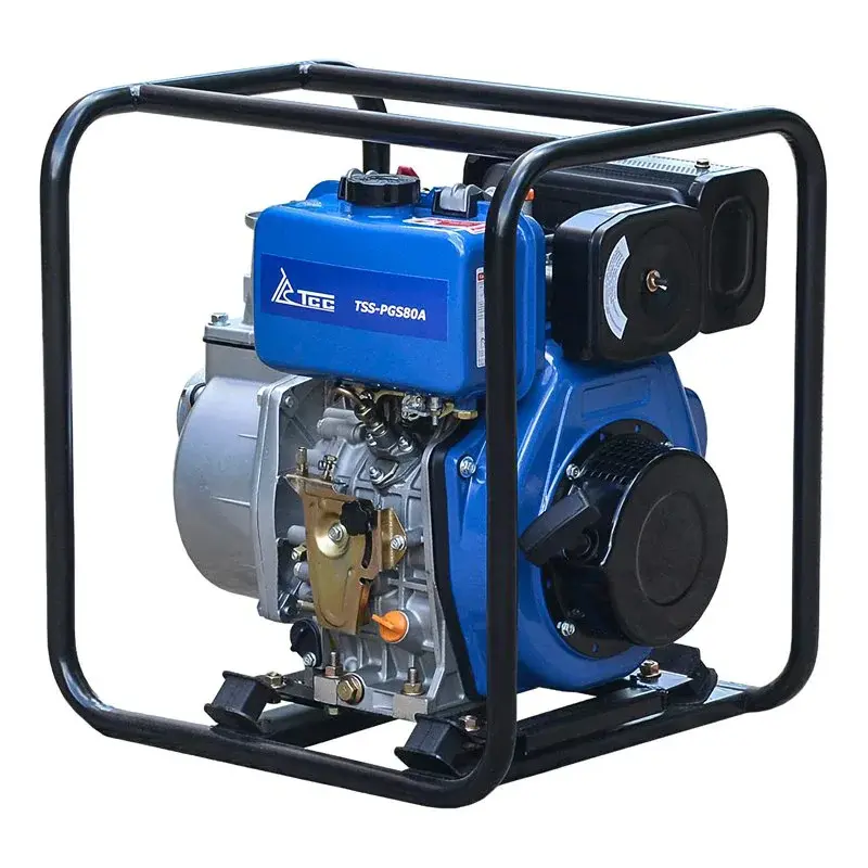 В мотопомпе TSS-PGS80A установлен 4-тактный дизельный двигатель WS178FA. Он рассчитан на интенсивные нагрузки в течение длительного времени. Все основные узлы устройства защищены от случайных повреждений во время транспортировки или хранения прочной стальной рамой. Она также образует в верхней части ручки для переноски, а в нижней формирует устойчивое основание.