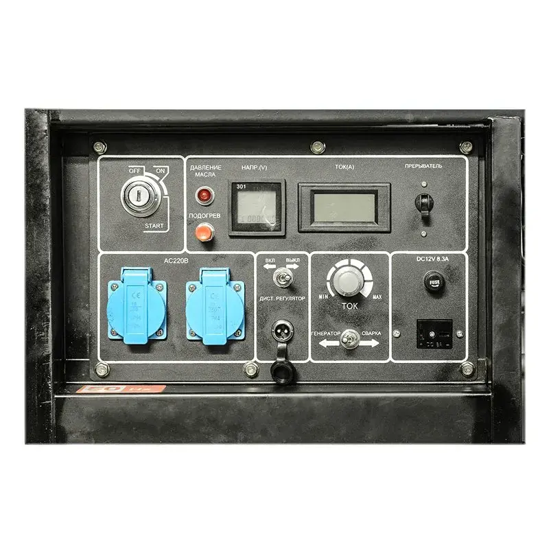 - Многофункциональный Дисплей отображает все основные параметры работы генератора: Силу Тока, Нагрузку, Напряжение, Частоту Тока, и Отработанные Мото-часы для своевременного технического обслуживания.