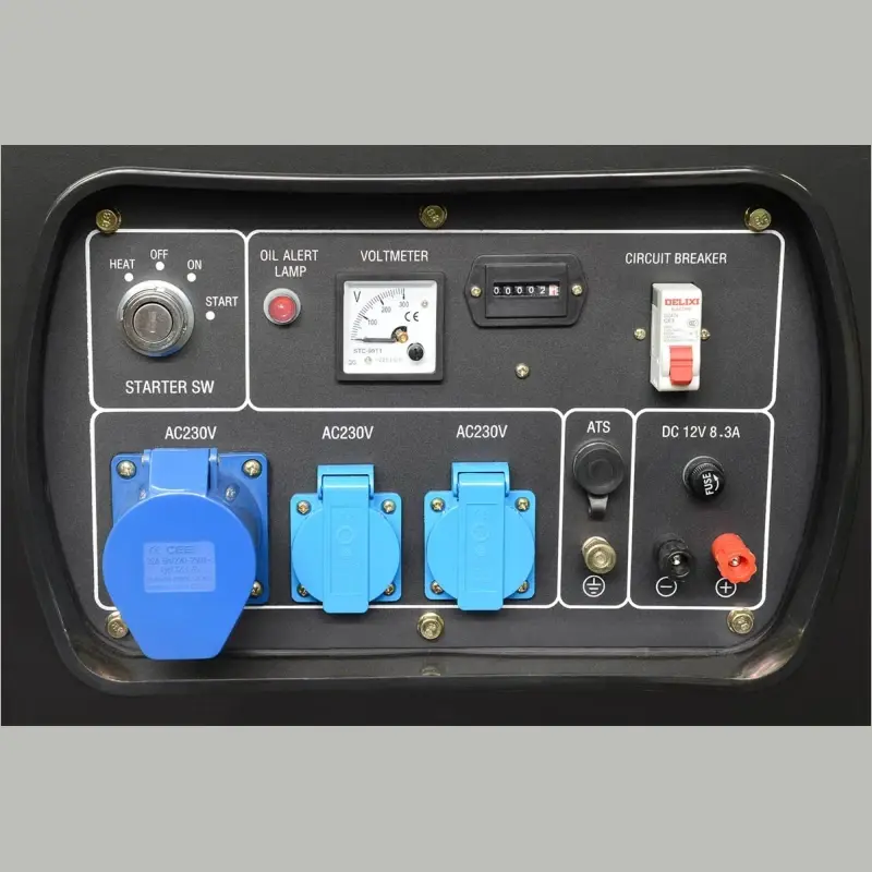 - Панель управления содержит вольтметр для отображения напряжения, счетчик моточасов, а также, индикатор уровня масла и индикатор топлива, автомат защиты.