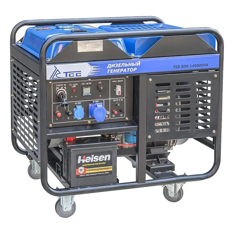 Дизельный генератор SDG 14000EHA предназначен для выработки электроэнергии с основными характеристиками: напряжение 220 вольт, частота 50 Гц и номинальной мощностью 12 кВт, оснащенный колесным комплектом для удобства передвижения.