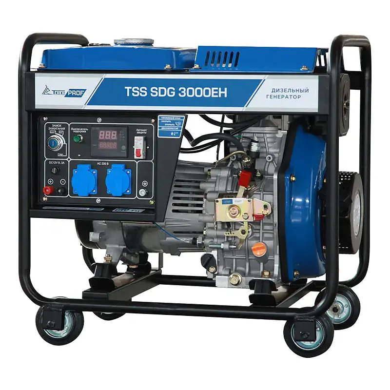 Дизельный генератор TSS SDG 3000EH с надежным и экономичным двигателем и электростартером. Для удобства передвижения оснащенный колесным комплектом.