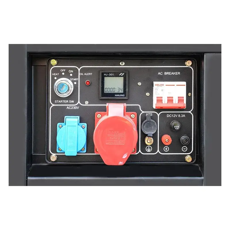 Дизельный генератор оснащен двумя розетками для подключения потребителей однофазного и трехфазного тока. На передней панели расположены индикаторы, сигнализирующие о перегрузке или низком уровне масла. Автоматический выключатель срабатывает в случае короткого замыкания или подключения слишком большой нагрузки. На многофункциональном дисплее отображаются рабочие показатели, такие как напряжение, частота, сила тока и моточасы. Вместительный топливный бак обеспечивает автономную работу в течение 6,4 часов.