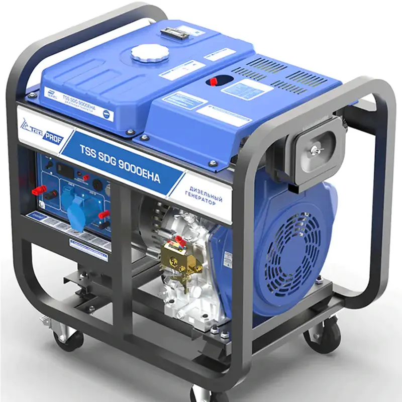 Дизель генератор с электростартом и с разъемом для подключения блока автоматики. TSS SDG 9000EHА предназначен для выработки электроэнергии с основными характеристиками: напряжение - 220 вольт, частота 50 Гц и номинальной мощностью 8,0 кВт, оснащенный колесным комплектом для удобства передвижения.
