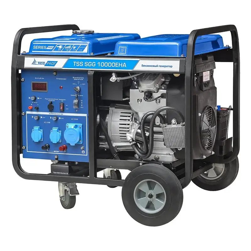 Бензогенератор TSS SGG 10000EHA на четырех колесах способен питать однофазное оборудование мощностью до 10 кВт. Модель отлично подходит для использования как в качестве запасного источника питания, так и основного.